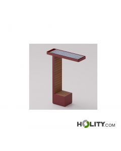 Banc urbain individuel en acier et bois d’okoumé, avec panneau photovoltaïque et luminaire. Dimensions : L 150 x P 49 x H 215 cm.