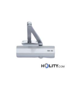 Ferme-porte à vérin avec bras et arrêt. Vitesse de fermeture réglable de 180° à -15°. Couleur : argent. Production certifiée ISO 9001 et EN 1154.