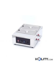Fondoir à chocolat au bain-marie en inox avec 6 GN 1/6 et affichage numérique. Puissance : 1500 W. Dimensions : L 41 x P 67 x H 17 cm.