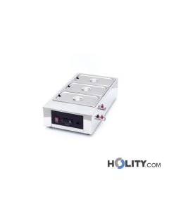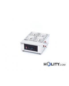 Fondoir à chocolat au bain-marie en inox avec 4 GN 1/6 et affichage numérique. Puissance : 1500 W. Dimensions : L 41 x P 49,5 x H 17 cm.