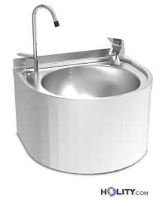 Fontaine murale avec structure arrondie. Matériau : acier inox. Dimensions : L.35 x P.30 x h.20 cm.