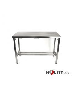 Table en acier inoxydable démontable avec pieds réglables et plateau avec évacuation. Dimensions : L 130 x P 60 x H 90 cm.